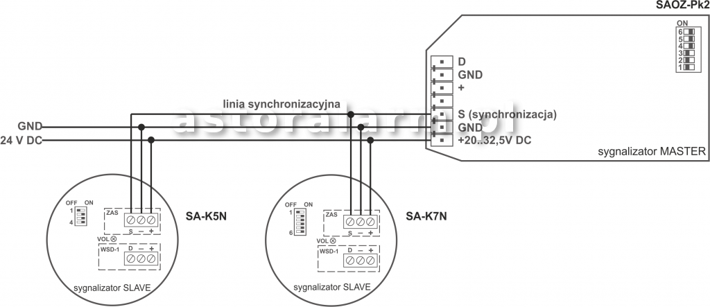 Schemat synchronizacji sygnalizatorów SA-K5N, SA-K7N, SAOZ-Pk2